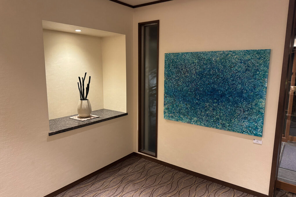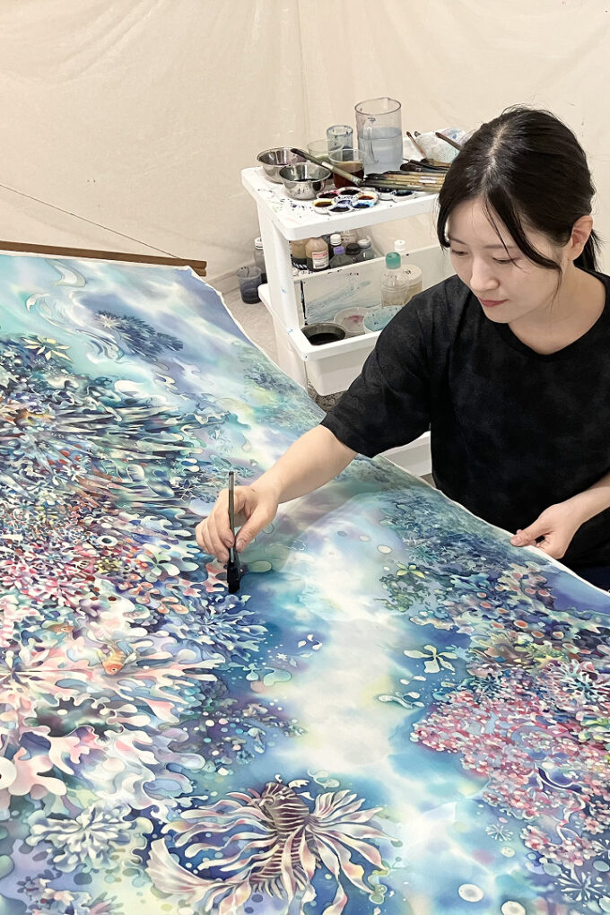 梅田は染色表現、とりわけ蝋染めの技法を通じて、新たな絵画表現の可能性を追求している。